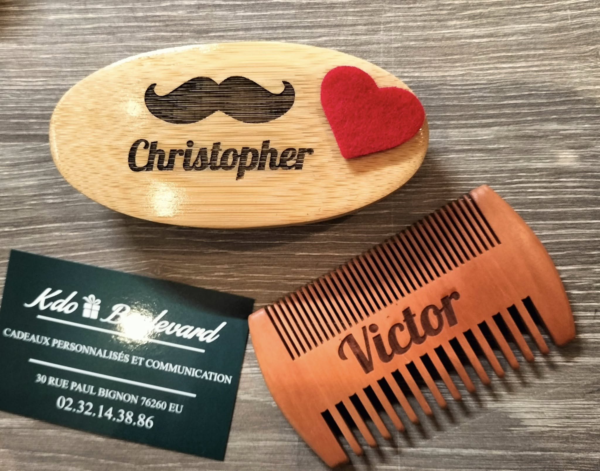 Offrez un coffret à la fois pratique et unique avec ce lot composé d’une brosse et d’un peigne en bois personnalisables.