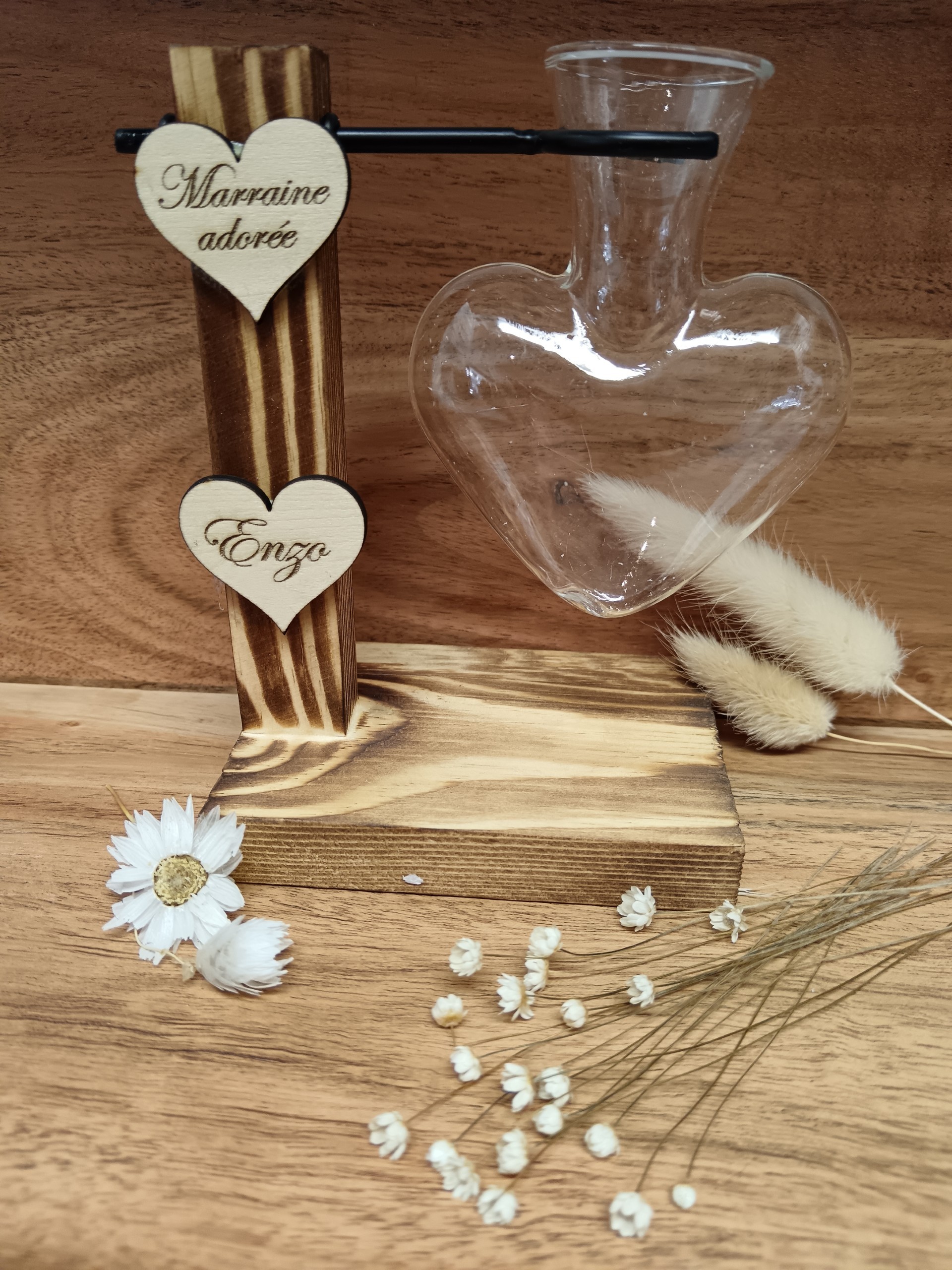 Offrez un cadeau tendre et unique avec ce vase cœur en verre monté sur un support en bois . 2 coeurs gravés au laser avec les prénoms ou le texte de votre choix. Un objet déco à la fois élégant et plein de symbolique, parfait pour exprimer votre affection.