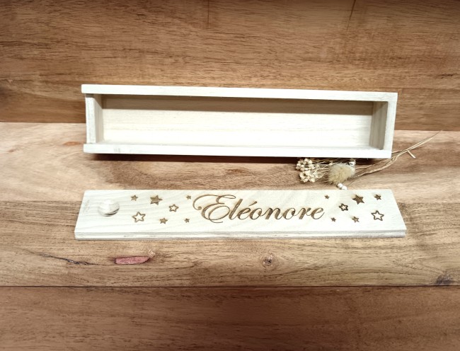 Boîte à crayons en bois naturel, personnalisée avec le prénom ou le texte de votre choix, gravé au laser.