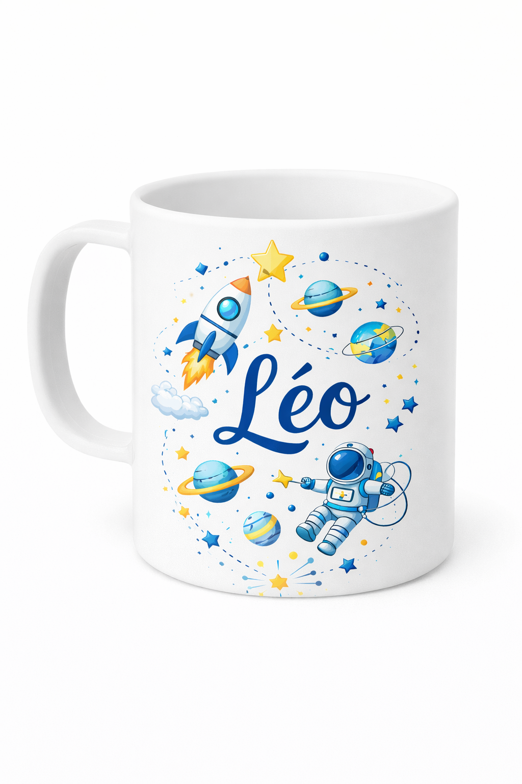 Joli mug enfant incassable personnalisé avec prénom, décoré d'un joli astronaute dans l'espace .