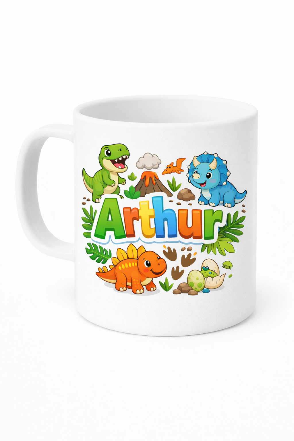 Joli mug enfant incassable personnalisé avec prénom, décoré de jolis dinosaures.