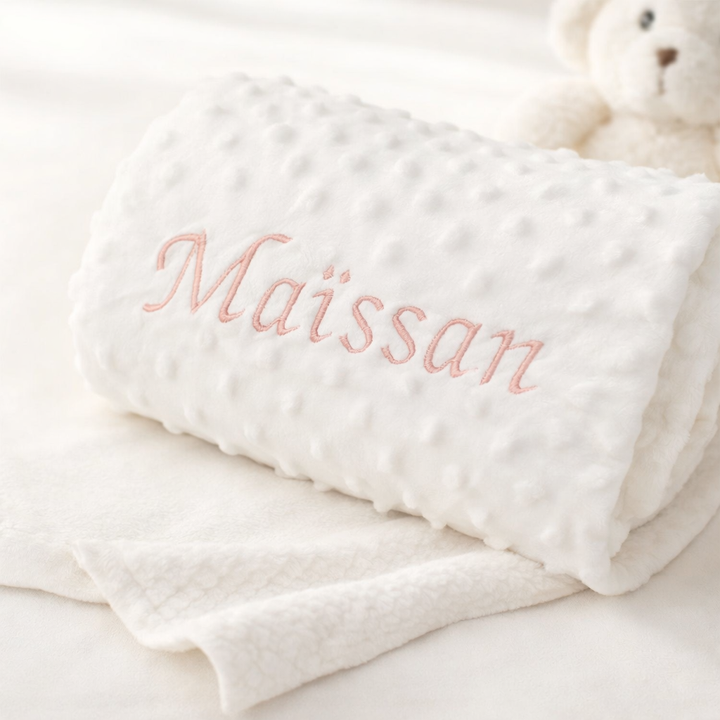 Ultra douce grâce à son tissu effet velours à relief (type minky), elle enveloppe bébé de chaleur et de confort dès la naissance. Le prénom est délicatement brodé pour un rendu élégant et durable dans le temps.