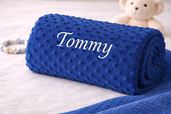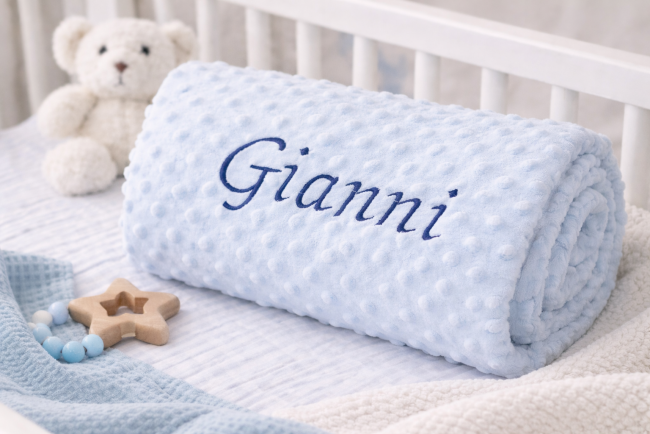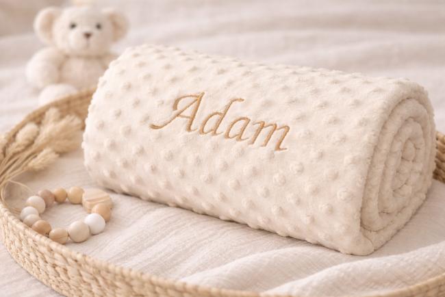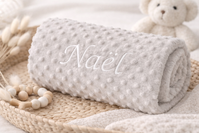Ultra douce grâce à son tissu effet velours à relief (type minky), elle enveloppe bébé de chaleur et de confort dès la naissance. Le prénom est délicatement brodé pour un rendu élégant et durable dans le temps.