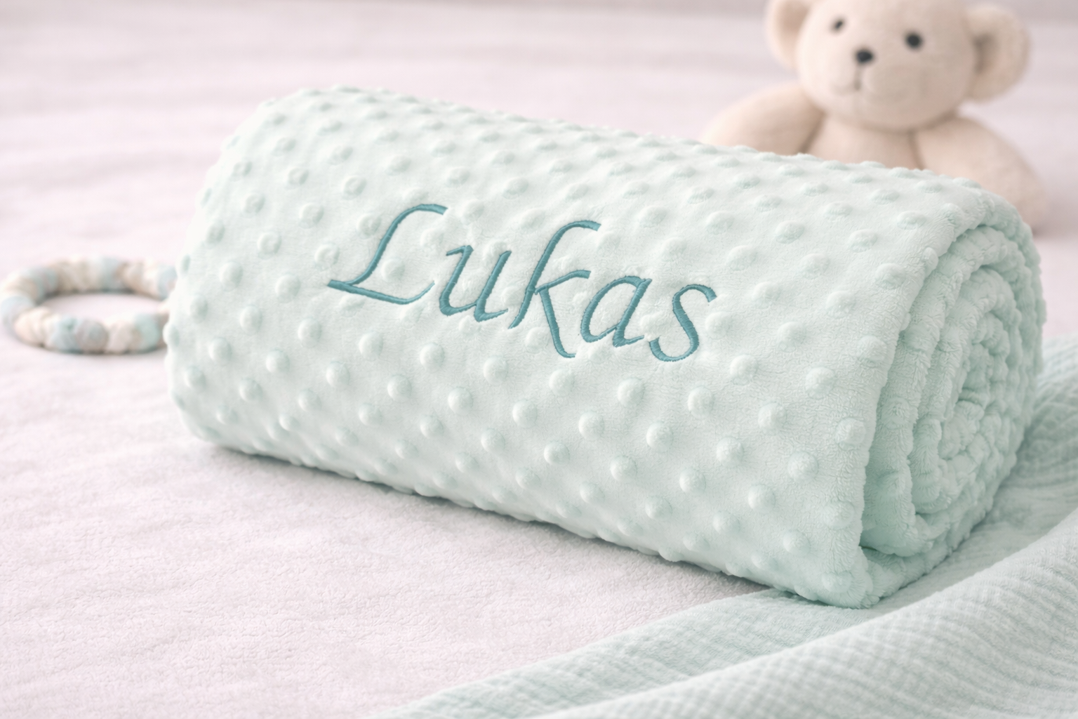 Ultra douce grâce à son tissu effet velours à relief (type minky), elle enveloppe bébé de chaleur et de confort dès la naissance. Le prénom est délicatement brodé pour un rendu élégant et durable dans le temps.