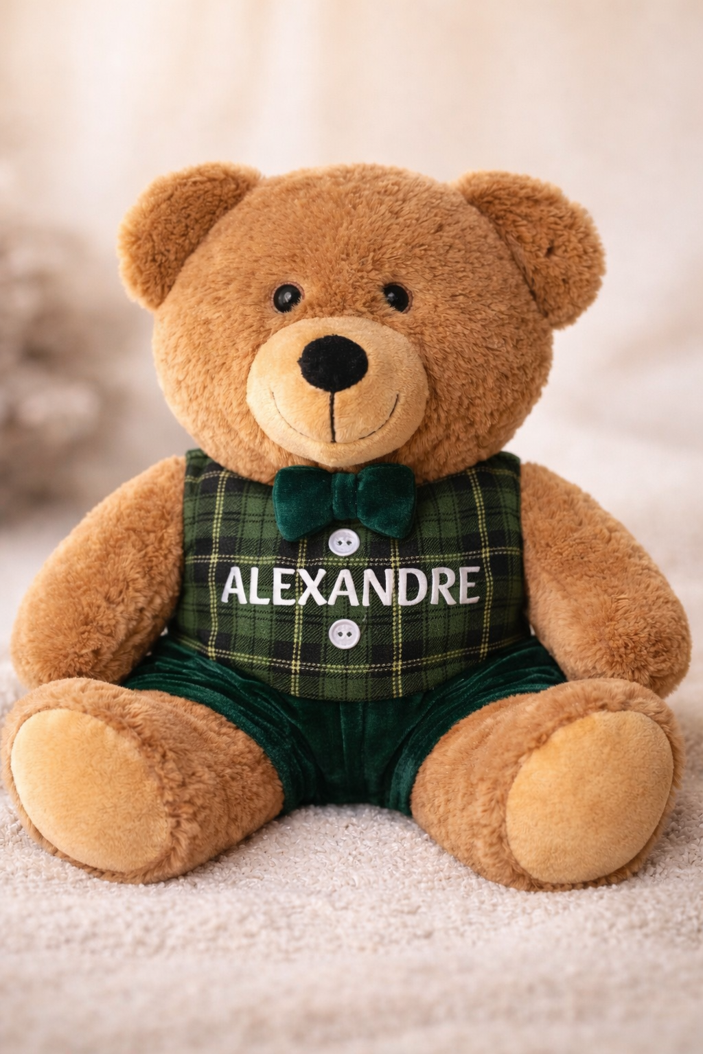 Ce nounours tout doux est habillé d’un joli ensemble élégant et peut être personnalisé avec le prénom de votre choix en flocage, pour un rendu net, moderne et durable.