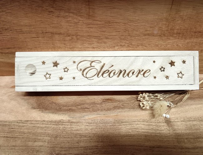 Boîte à crayons en bois naturel, personnalisée avec le prénom ou le texte de votre choix, gravé au laser.