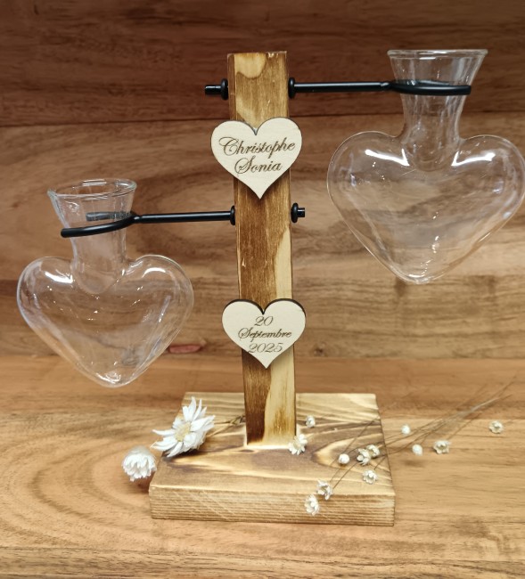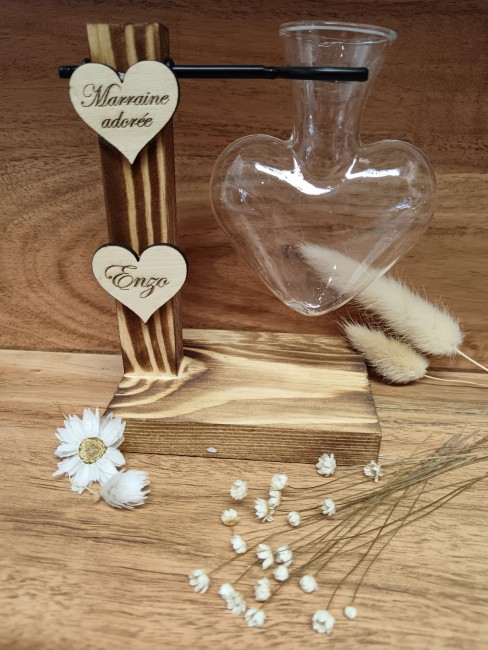 Vases cœur en verre sur support bois personnalisable – Cadeau marraine, parrain, maman, fête des grands-parents