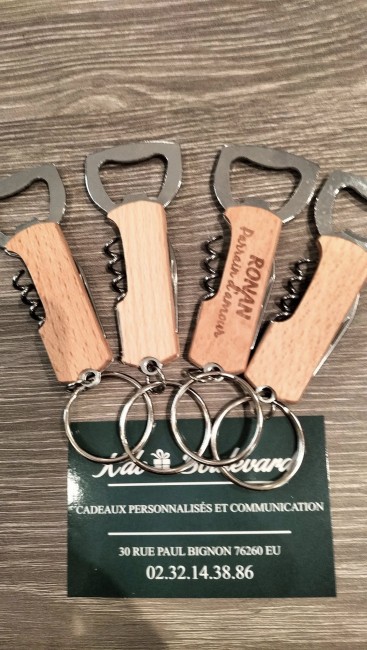 Porte-clés multifonction en bois personnalisable – Décapsuleur & tire-bouchon gravé