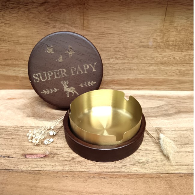 Cendrier en bois et métal avec couvercle gravé au laser.